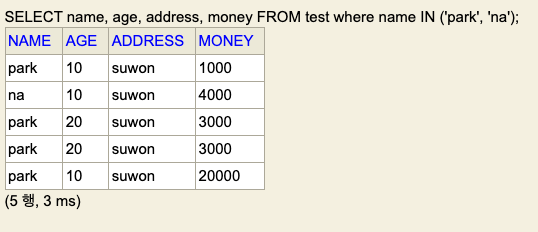 SELECT name, age, address, money FROM test where name IN ('park', 'na');