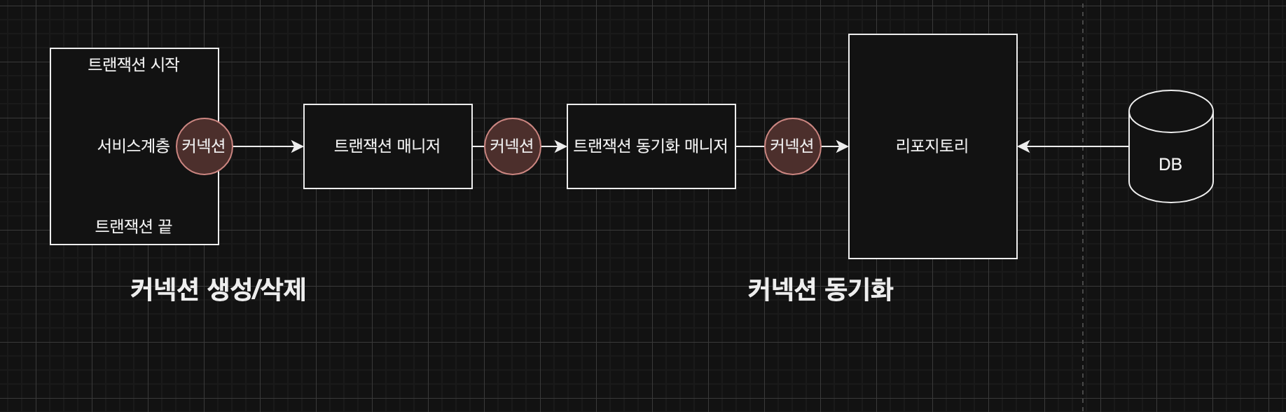 Spring에서는 트랜잭션 경계를 지정하면 내부적으로 TransactionSynchronizationManager를 통해 ThreadLocal 기반으로 Connection을 저장 및 공유한다.